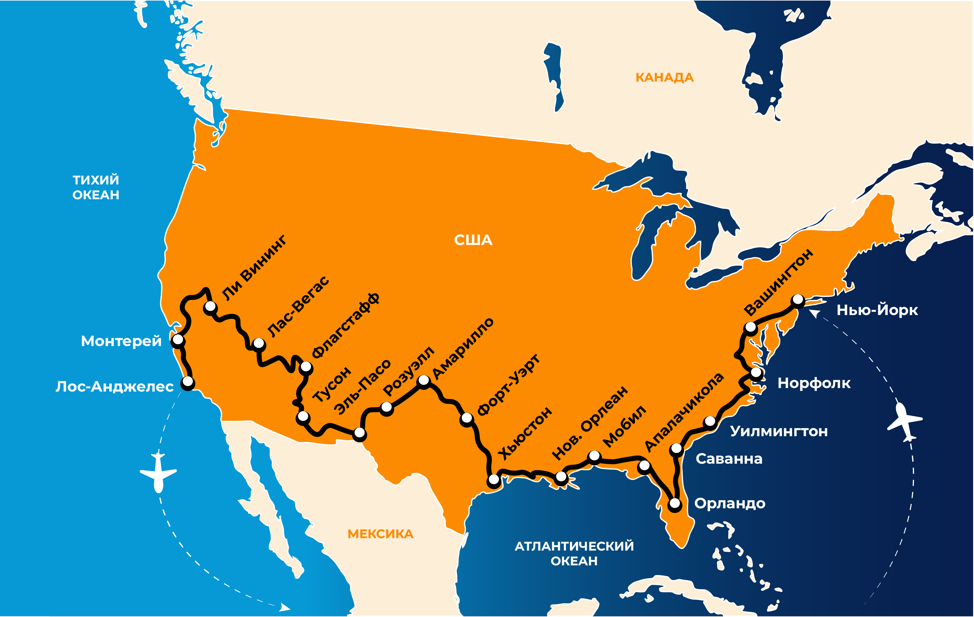 Route: New York Washington, D.C. – Norfolk/Chesapeake – Wilmington – Savannah – Orlando – Apalachicola – Mobile – New Orleans – Houston – Fort Worth – Amarillo – Roswell – El Paso – Tucson – Flagstaff – Las Vegas – Lee Vining – Monterey – Los Angeles