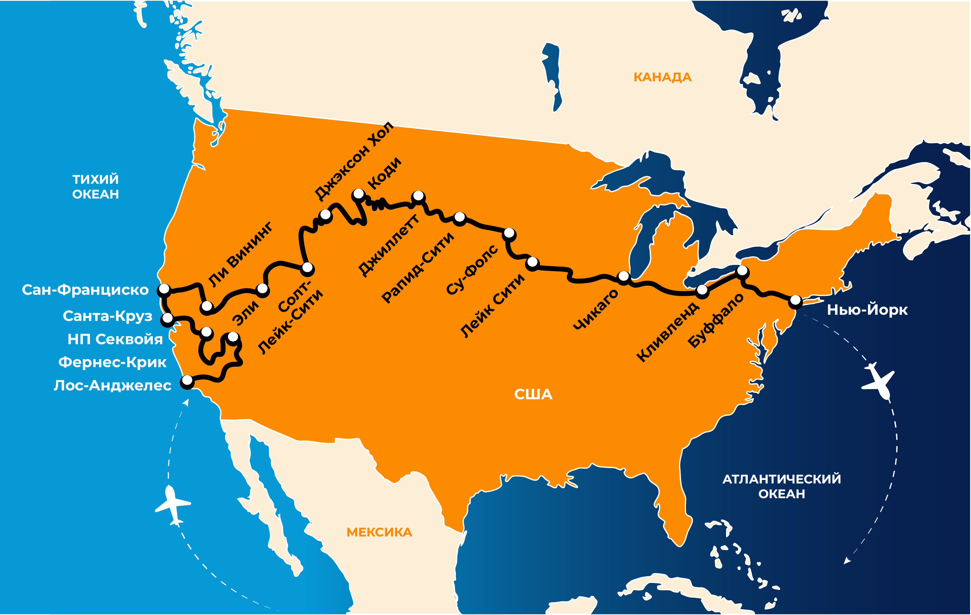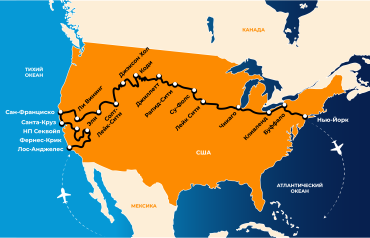 Los Angeles – Furnace Creek – Sequoia National Park – Fresno – Santa Cruz – San Francisco – Lee Vining – Ely – Salt Lake City – Jackson – Cody – Gillette – Rapid City – Sioux Falls – Lake City/Red Wing – Chicago – Cleveland – Buffalo – New York