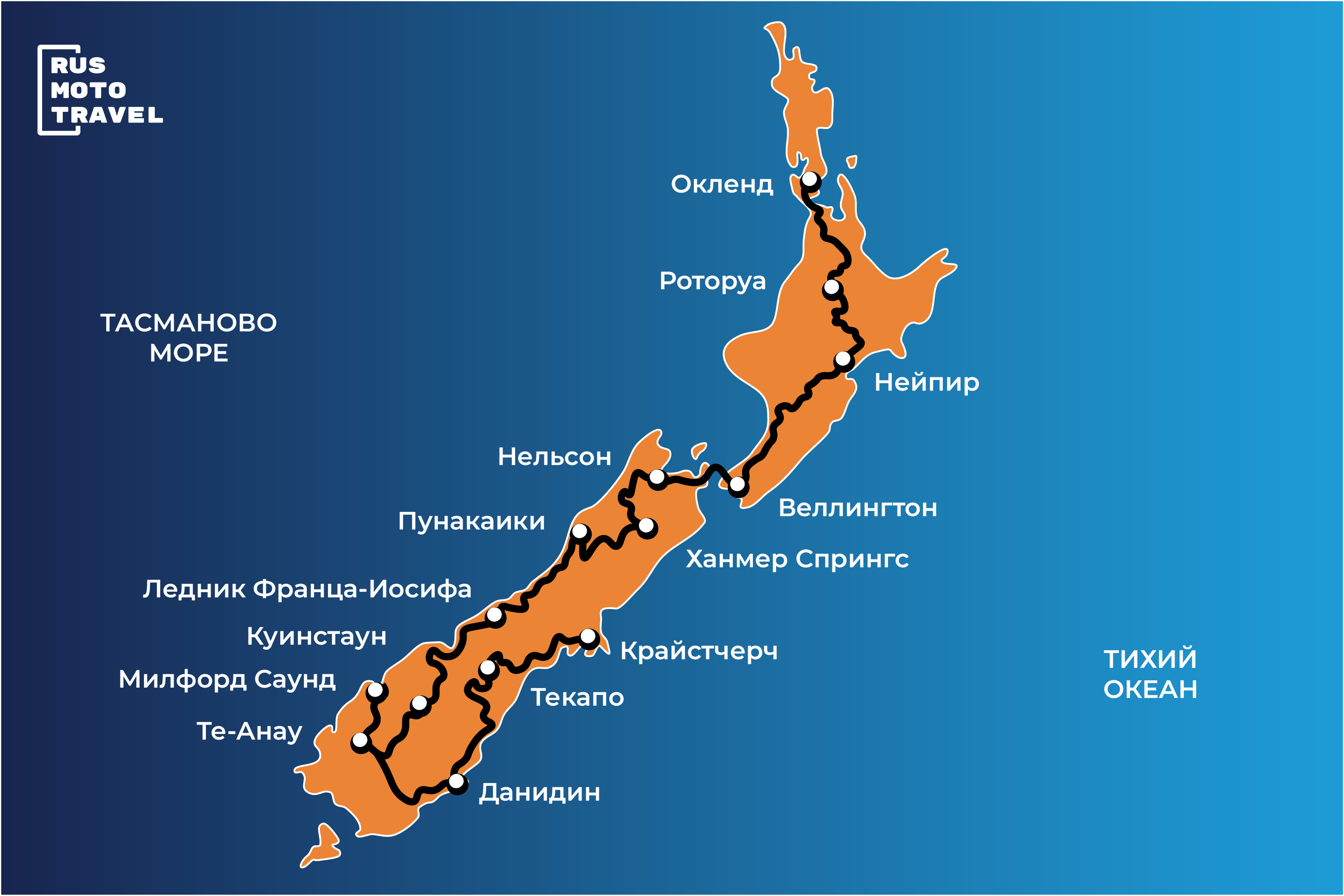 Auckland – Rotorua – Napier – Wellington – Nelson – Hanmer Springs – Punakaiki – Franz Josef Glacier – Queenstown – Milford Sound - Te Anau – Dunedin – Tekapo – Christchurch